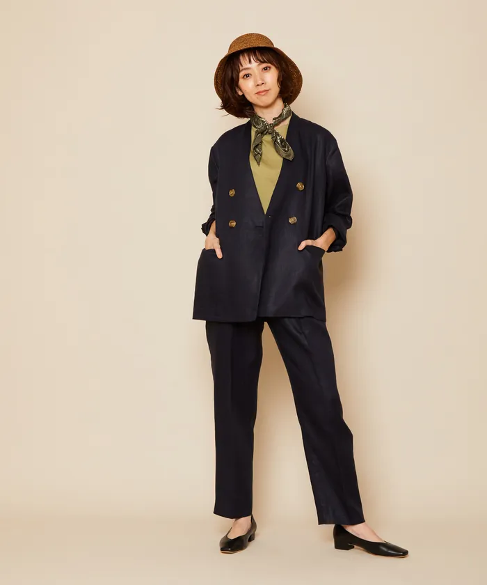 リネンノーカラーダブルジャケット、リネンテーパードパンツ