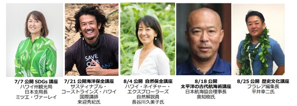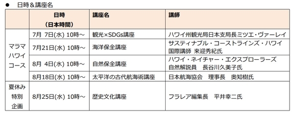 「マラマハワイコース」は、旅行会社、教育機関、報道機関、学生、一般の方を対象に、全4回シリーズでお届けします。ハワイ州観光局日本支局長による観光×SDGs講座(7/7公開)を皮切りに、サスティナブル・コーストラインズ・ハワイ国際講師による海洋保全講座(7/21公開)、ハワイ島自然解説員による自然保全講座(8/4公開)、日本航海協会理事長による太平洋の古代航海術講座(8/18公開)です。また、夏休み特別企画として、フラレア編集長による歴史文化講座(8/25公開)も開講します。受講申込は、ハワイ州観光局の公式ポータルサイト「allhawaii」内の「ハワイ州観光局 業界サイト」(https://www.allhawaii.jp/business/article/travel/350/ )にて受け付けています。