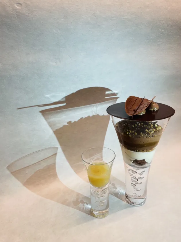 「パフェ」という言葉の由来は、フランス語の「パルフェ(parfait)」が語源と言われています。この「パルフェ」とは、「パーフェクト」という意味です。日向夏ソースの酸味とバニラムースの甘い風味、KAOKA社の品のあるオーガニックチョコの酸味が織りなす味わい。また、キャラメリゼアーモンドやチュイール、シュトロイゼルのザクザクした食感と、チョコレートムースやバニラムースの滑らかな口当たりが自慢の一品です。層を進むと一口毎に変化する食感や香り、味わいを5感で楽しんでいただけるまさにパーフェクトなパフェになっています。