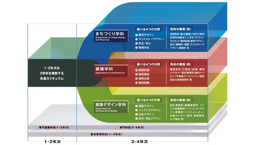 1・2年次は専門に偏ることなく、共通カリキュラムで建築学の基礎や一般教養を幅広く学びます。3,4年次には学科ごとに分かれ、いずれかの分野に軸足を置きながら、関連する他学科・他分野の科目も合わせて履修して、興味のある領域をより深く学んでいくことができます。