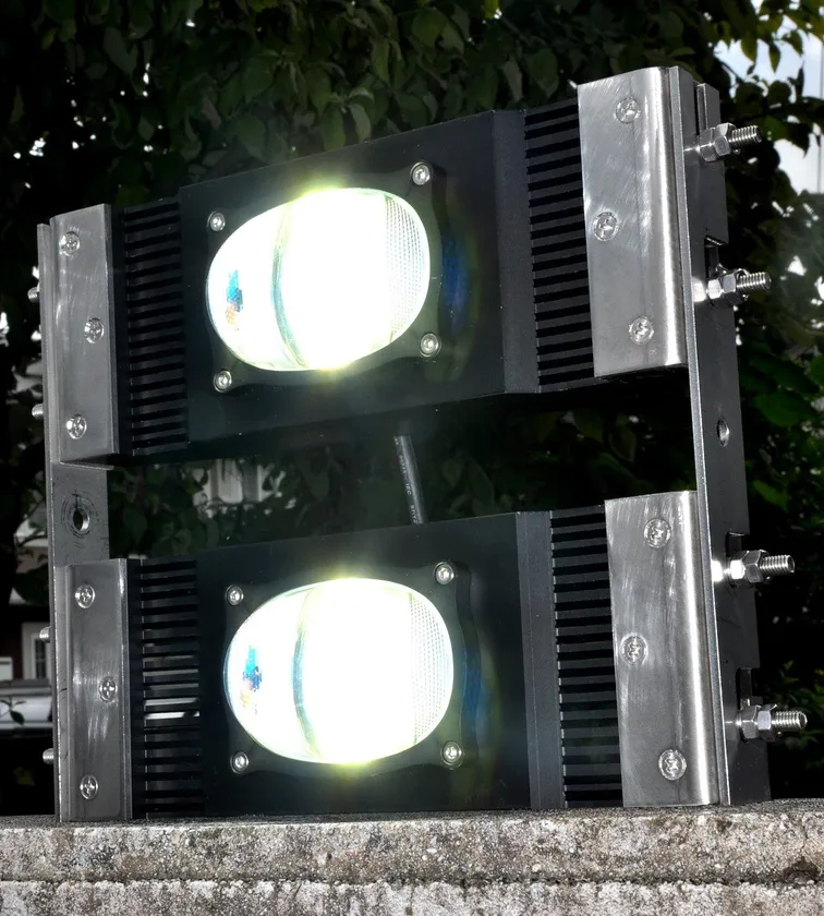 今までのLED集魚灯は、多光源式は勿論、単光源式であっても、長方形であった為、船舶の横面に多数並べると横風の影響を受けやすく、またそれらのLED機器には直流交流・電流電圧変換装置(以下、電源)が組み込まれており、大変重量が重くなっていた為、船舶重心が上がり過ぎ、横風や横波により大きな横揺れの原因となり易く、安定さを欠いていました。第三世代LED集魚灯は、発光部を球形のセードで覆い、その両側に、風を背面に流す開口部を設けて、「速度圧係数」(理論上の横風に依る横力に対する、実際に生ずる横力の比率)を小さくし、併せて電源を別(通常はキャビンの座席下等)置きにしたことで重心が下がり、従来のメタルハライドに比べ横揺れが非常に小さくなったと評価されております。