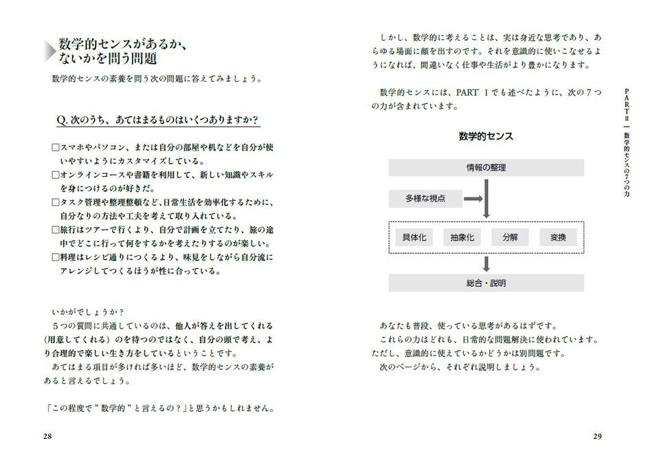 そこで本書では、数学的センスとはどういうもので、どうすれば身につくのか、この1冊を読めばわかるように解説していきます。数学が苦手な人でも、数学で挫折した経験がある人でも、中学や高校の数学の授業とはまったく別物の内容ですから安心してください。
