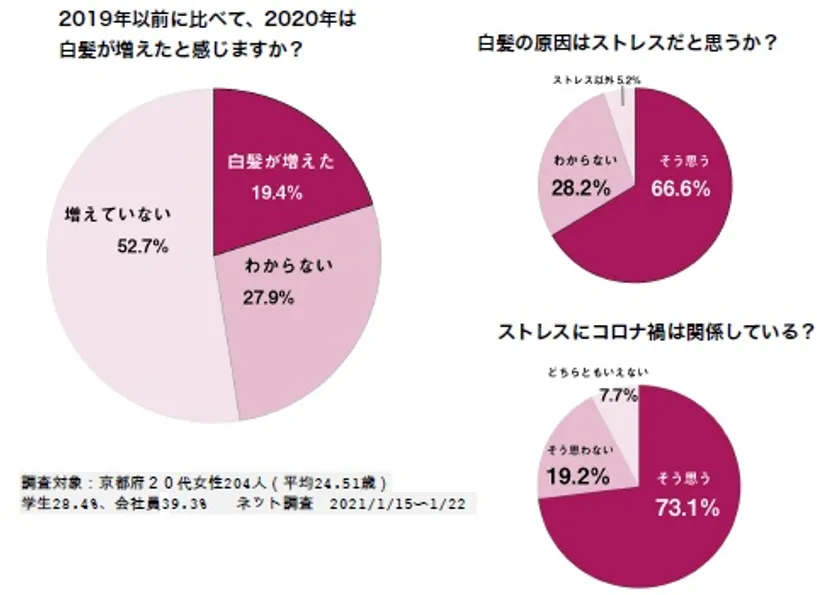 その結果、2019年に比べて白髪が増えた20代女性が全体のおよそ2割に達し、その66.6%が原因はストレスと考え、さらにストレスにはコロナ禍が関係しているとした女性は73%に昇っています。