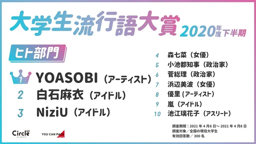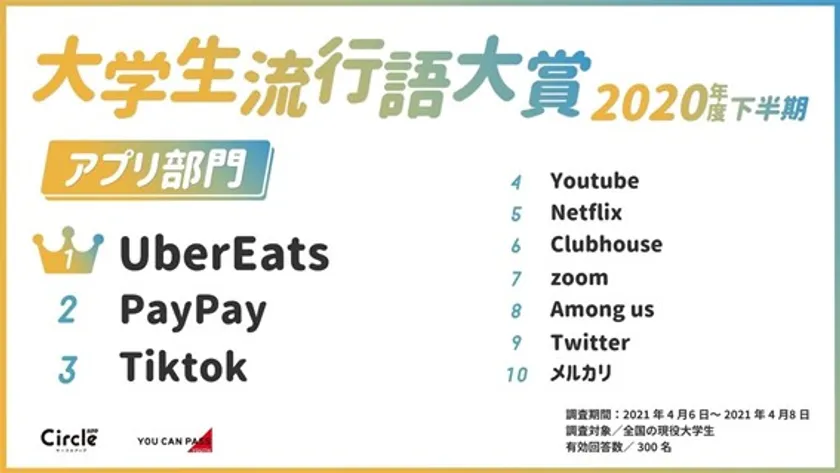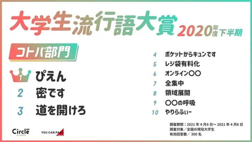 大学サークルのプラットフォームアプリ「サークルアップ」( https://circle-app.jp/lp )を運営する株式会社ユーキャンパスユース(本社:東京都港区、代表取締役会長:渡部 陽)はサークルアップに登録する全国の現役大学生300名へのアンケートをもとに、「ニューノーマルに領域展開!大学生流行語大賞2020年度下半期」を発表いたします。