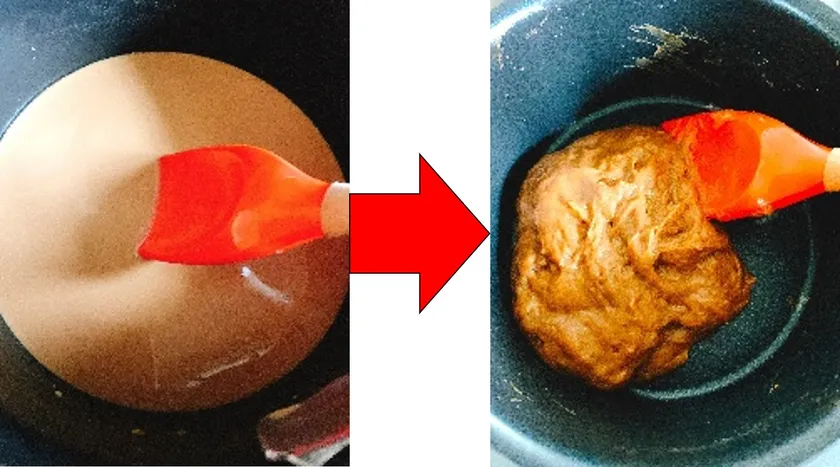 2. 弱火にして木べらで絶えずかき混ぜ、とろみがついてきたら艶がでるまで