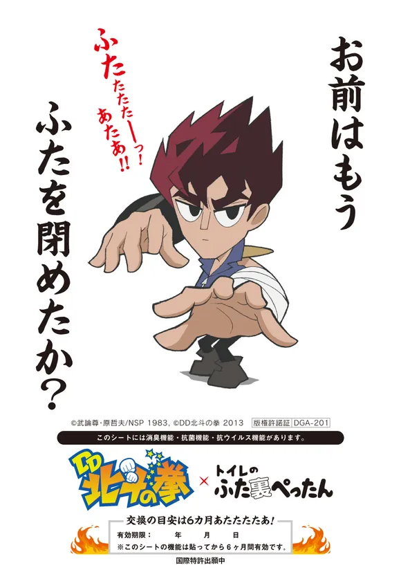 そしてこの度、幅広い世代に人気のある北斗の拳とコラボすることで、より多くの方々へトイレのふたを閉めて流す習慣の啓発が促進できることを期待し、北斗の拳のギャグ漫画DD北斗の拳とコラボした『DD北斗の拳×トイレのふた裏ぺったん』を販売することが決定しました。