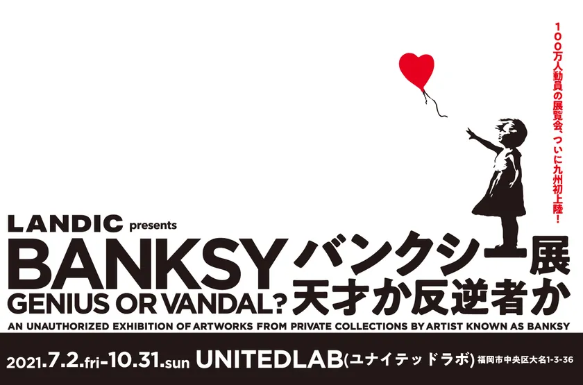 「BANKSY~GENIUS OR VANDAL?~福岡実行委員会」は、2018年からモスクワ、マドリード、リスボン、香港など世界5都市と横浜、大阪、名古屋で100万人以上を動員する展覧会『LANDIC presents BANKSY GENIUS OR VANDAL?(バンクシー展 天才か反逆者か)』を福岡市大名の次世代型ライブエンターテイメント施設「ユナイテッドラボ」で7月2日(金)~10月31日(日)に開催します。