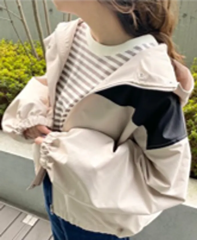 「本当に1枚あるととっても便利!」と、実感を込めて嬉しそうに話してくれた内田さん。前に付いているジップ&ボタンが風を防いでくれそうだし、特にこの季節は寒暖差で肌寒い時に最適!小旅行とか天候が悪い日はもちろん、着る服に困るお散歩の時にもおススメかも♪シャカシャカした生地で軽い素材は、「これぞマウンテンパーカー」って感じ。防水スプレーをしたら雨の日でも着られそうだし、長すぎず短すぎずのちょうどいい着丈で使いやすいと思いますよ!とオススメしていました。