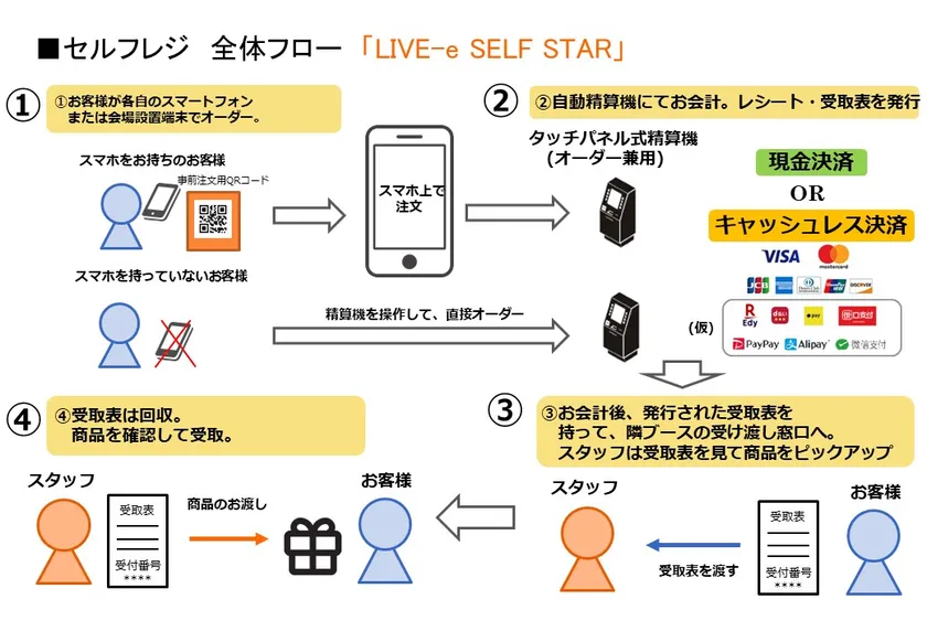 LIVE-eSELF STARは来場者、運営スタッフ両側に対して感染防止対策を講じ、安全、安心な環境整備を目的として開発、セルフレジをニューノーマルとする事でリアル販売再開を目指しています。