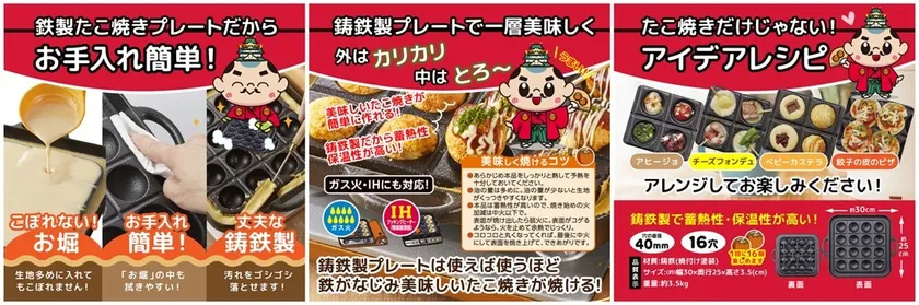 (2)蓄熱性・保温性に優れた鋳鉄製プレートだから焦げ付きにくく外はカリカリ、中はトロッとしたたこ焼きが作れます。