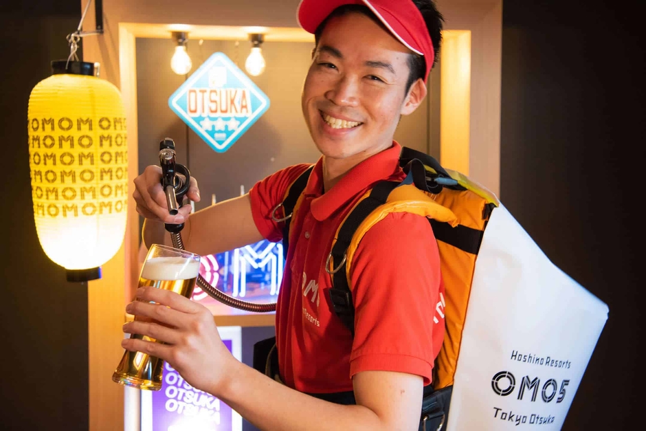 OMOの酔いどれ師範代こと「OMOレッド」が、ビールの売り子に変身!はしご酒のツアーを担当している「OMOレッド」ですが、コロナの影響で、なかなかツアーが催行できていません。そんななか、お客様を喜ばせるため、ビールサーバーをかついでお部屋に生ビールをお届けします。18時までにお部屋のドアにビールオーダー用のドアプレートをかけておけば、OMOレッドがお部屋に伺います。1杯目は無料、2杯目以降は有料にて提供します。