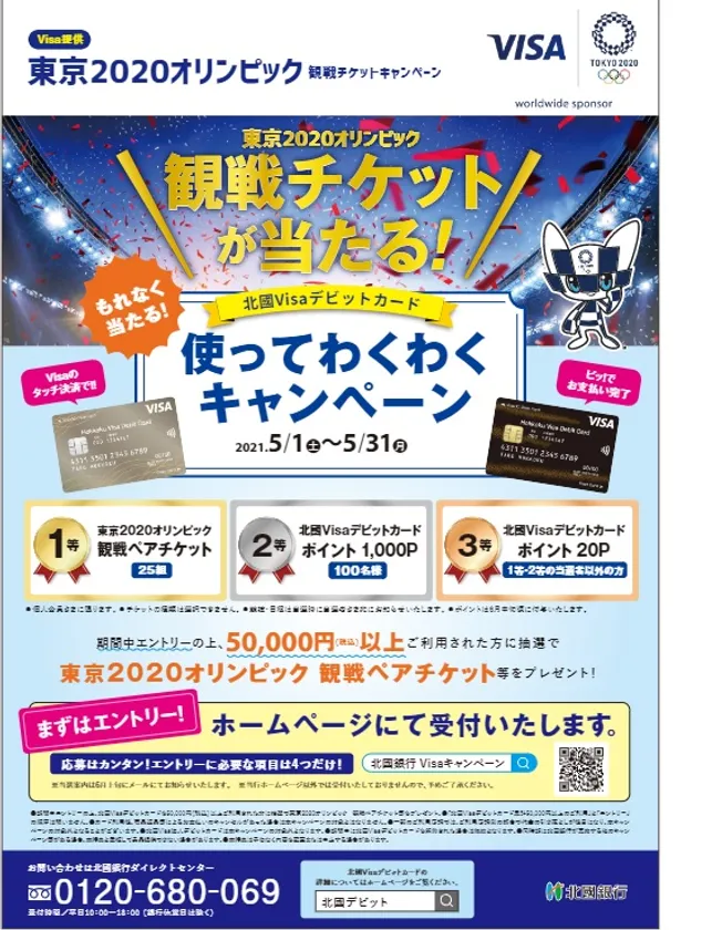 株式会社北國銀行(頭取 杖村 修司)は、「東京2020オリンピック観戦チケットが当たる!北國Visaデビットカード使ってわくわくキャンペーン」を実施中です。