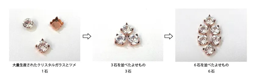 単純なひとつひとつのパーツやツメ(クリスタルを留める土台)を寄せ集め、それらをろう付けと呼ばれる溶接で、様々な形のジュエリーに作り上げる技術です。