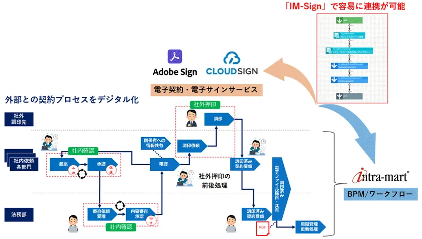 株式会社NTTデータ イントラマート(本社:東京都港区、代表取締役社長:中山 義人、以下:イントラマート社)は、Digital Process Automation Platform「intra-mart(R)」※1と「Adobe Sign」※2「クラウドサイン」※3を容易に連携する「IM-Sign」をリリースしました。BPM/ワークフローと電子契約・電子サインサービスをシームレスに連携することで、外部との契約プロセスに加え、契約行為の前後を含む業務プロセス全般を素早くデジタル化し、企業のデジタルトランスフォーメーション(DX)を実現します。