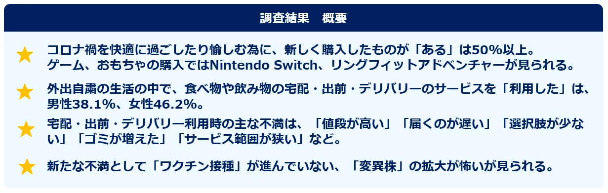 外出自粛の生活の中で、食べ物や飲み物の宅配・出前・デリバリーのサービスを「利用した」は、男性38.1%、女性46.2%。 新たな不満として「ワクチン接種」が進んでいない、「変異株」の拡大が怖いが見られる。 ーインサイトテック ユーザーアンケートー