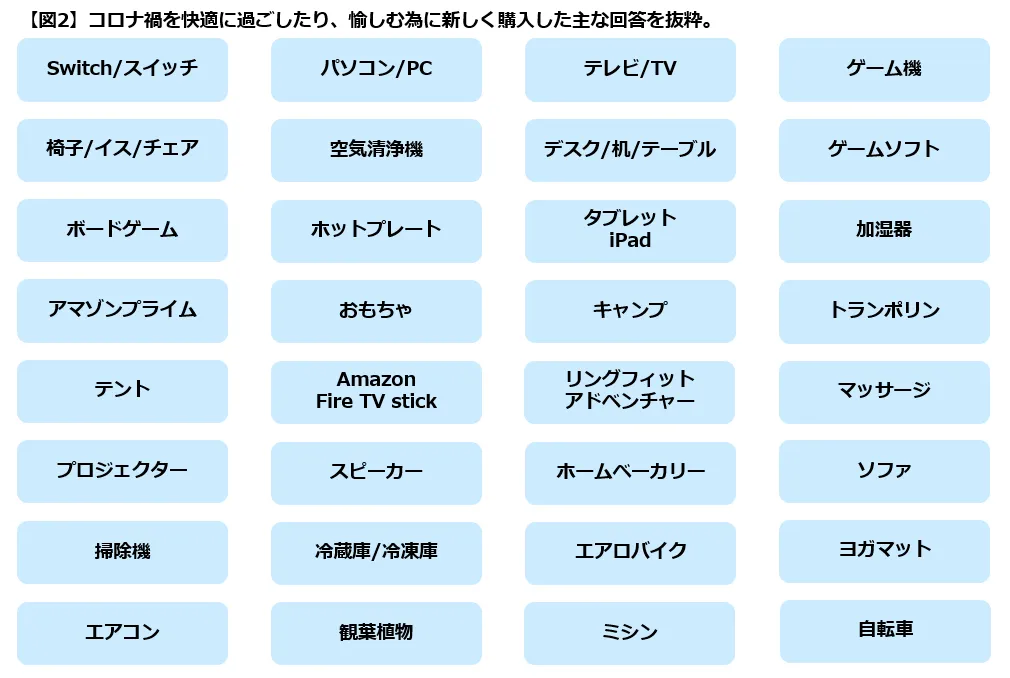 ・コロナ禍を快適に過ごしたり、愉しむ為に、新しく購入したものを確認すると、家族や友人・知人と遊ぶためのゲームや、おもちゃが多く見られました。NintendoSwitch、リングフィットアドベンチャー、ゲームソフト、ゲーム機など、子供と一緒に遊ぶ目的で購入した人も多いと考えられます。