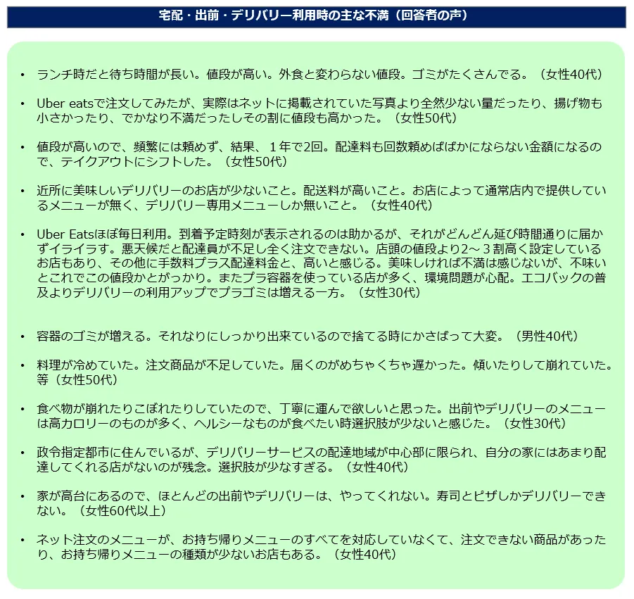 3:宅配・出前・デリバリー利用時の主な不満は、「値段が高い」「届くのが遅い」「選択肢が少ない」「ゴミが増えた」「サービス範囲が狭い」など。(図4)