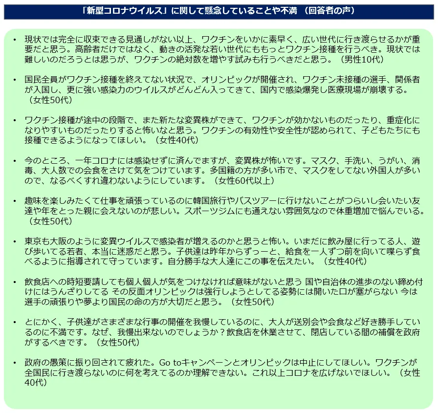 ・「「新型コロナウイルス」に関して懸念していることや不満をお知らせください。」と伺うと、今回の結果は昨年同時期に実施した結果と比較して、「ワクチン接種」が進んでいない、「変異株」の拡大が怖いといった新たな不満が見られます。