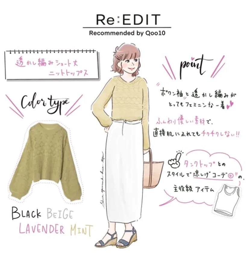 人気のコーナー、Qoo10 コーデ『今日のりおポチ』では、内田理央さんのこの春のおススメファッションアイテムとしてRe:EDIT(リエディ)の透かし編みショート丈ニットトップスが紹介されました。