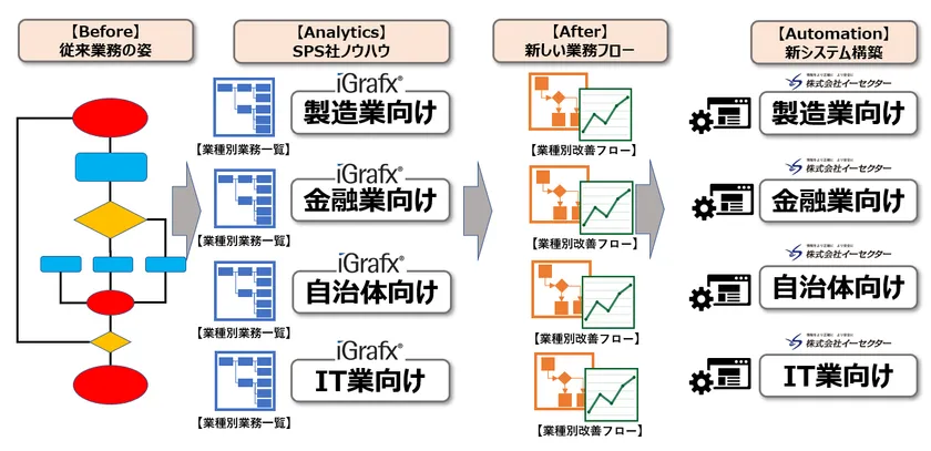 SPSが提供するiGrafxを用いた業務分析では、既存業務の可視化と改善ポイント分析が可能となり、改善ポイントをイーセクターが提供する自動化やデータ連携・統合ソリューションで効率化を図ります。