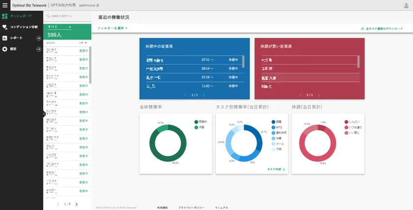 「Optimal Biz Telework」とは、テレワーク環境下においてコミュニケーションサポート、業務サポート、生産性向上サポートを実現する、テレワーク支援サービスです。本サービスを利用することで、従業員の稼働状況を確認することができ、いつ、どこで、だれが、どのような業務をしているかを可視化することができます。