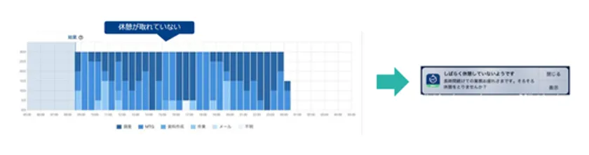 従業員が3時間以上休憩せずに稼働を続けた場合、端末(Windows/macOS)に休憩を促すpush通知を行います。適切な休憩を取ることで、体調の悪化や集中力の低下を予防いたします。