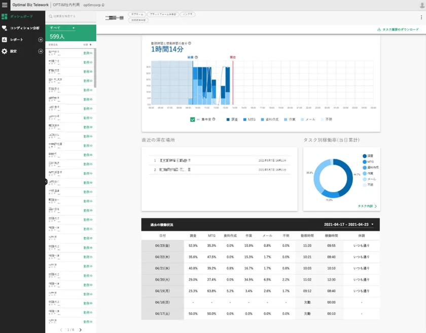 従業員ごとの時間帯別の詳細の稼働状況、滞在場所、および過去の稼働・体調の状況が確認できます。