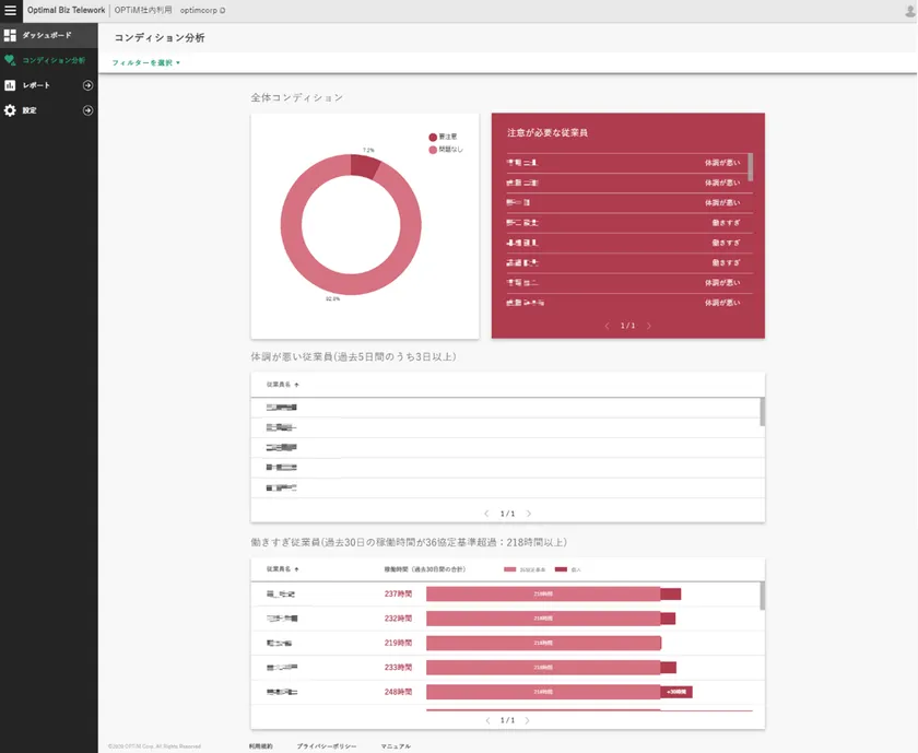 働きすぎや体調不良が継続しているなど、アラートの出ている従業員を確認することができます。