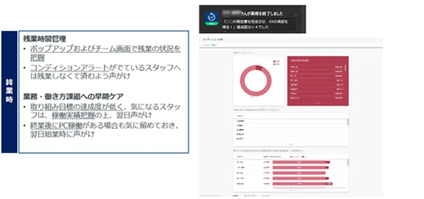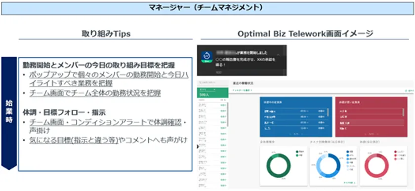 テレワーク環境下で課題となる、「従業員の体調管理や過剰労働の防止」「生産性向上に向けたセルフ・チームマネジメント強化」を実現するため、「Optimal Biz Telework」が1日の中で、どのように活用されているのかを、以下に活用事例としてTipsをまとめております。