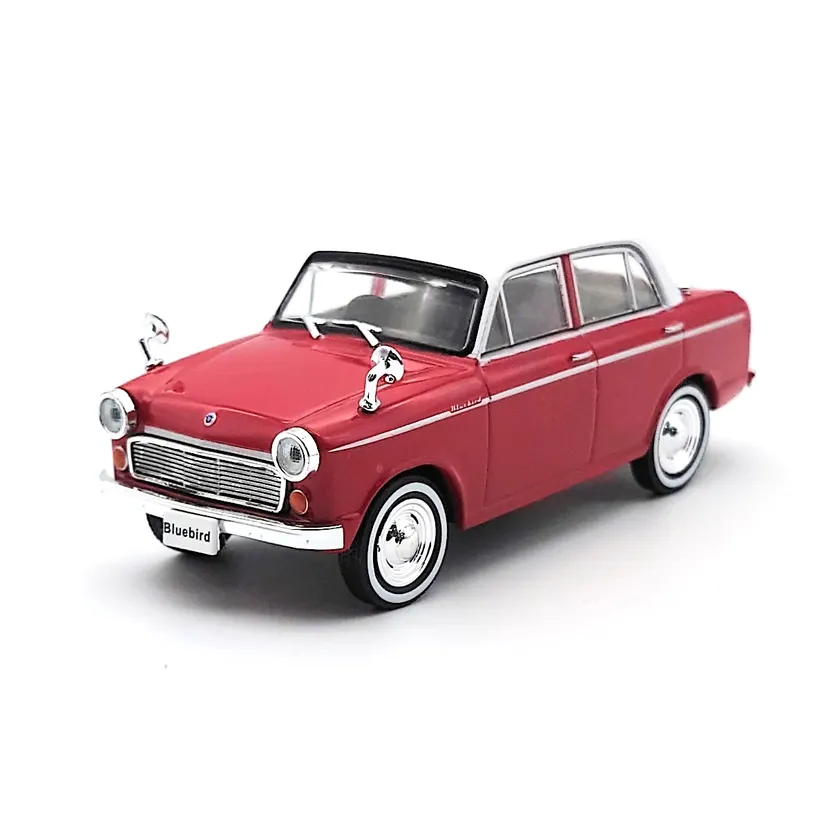1959年から60年代にかけて日産の主力車として駆け巡ったブルーバード 310。サイドモールには「BLUEBIRD」のロゴが輝き、タイヤは高級感のあるホワイトタイヤで再現されています。カラーはレッド/ホワイト。