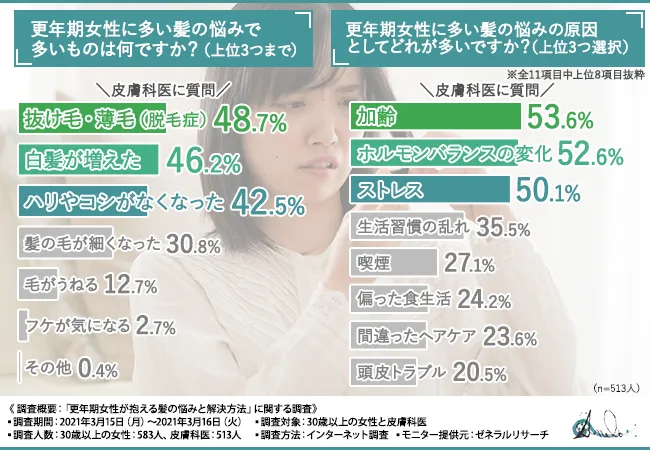 皮膚科医に聞いたアンケートでは、更年期の女性の場合、加齢や女性ホルモンのバランス変化といった原因が多いものの、ストレスや偏った食生活なども髪の悩みの原因になることがわかりました。