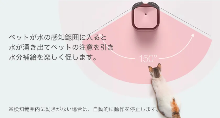 2つのセンサーで前面150°の範囲で約1.5メートルの範囲内に近づくと自動的に作動し水を供給します。自動で作動するので無駄な電力を消費せず、2.5Lの大容量で留守中にお水が少なくなってしまう心配や、忙しい時に頻繁に水の入れ替え手間が軽減されます。
