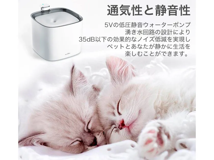 流れる水で興味を引くだけでなく、5Vの低圧静音ウォーターポンプにより35dB以下のノイズ低減を実現。落ち着いて水を飲めます。
