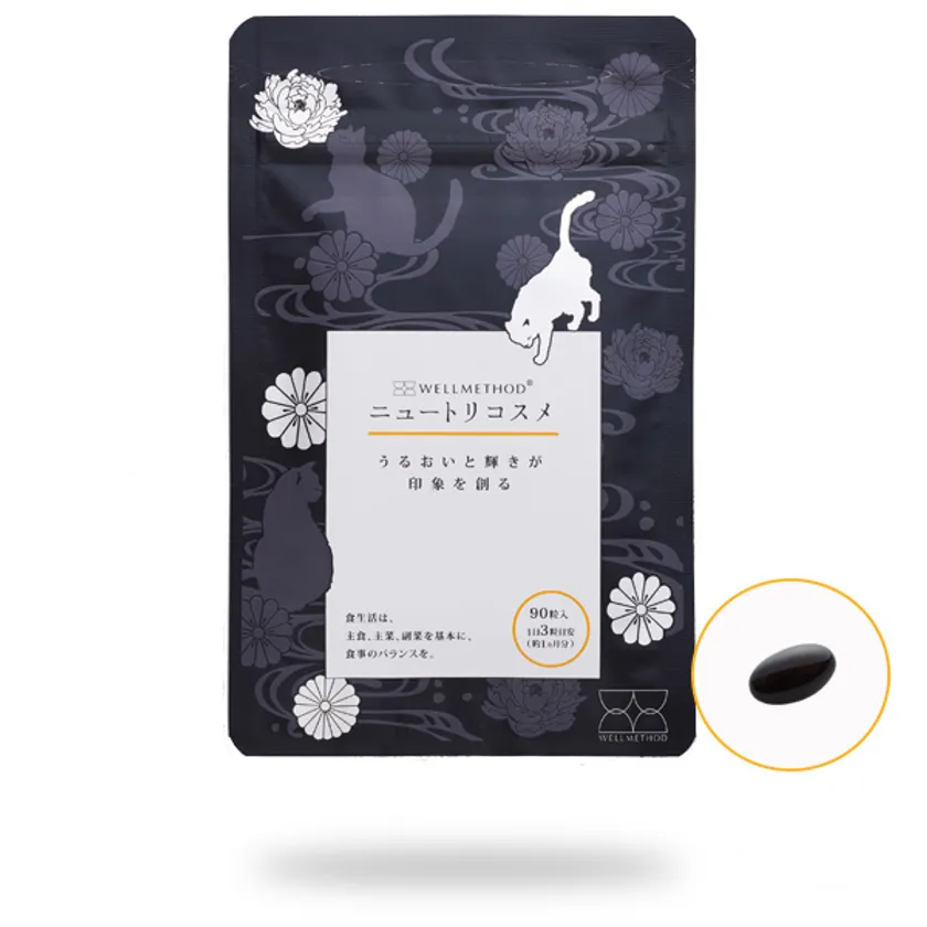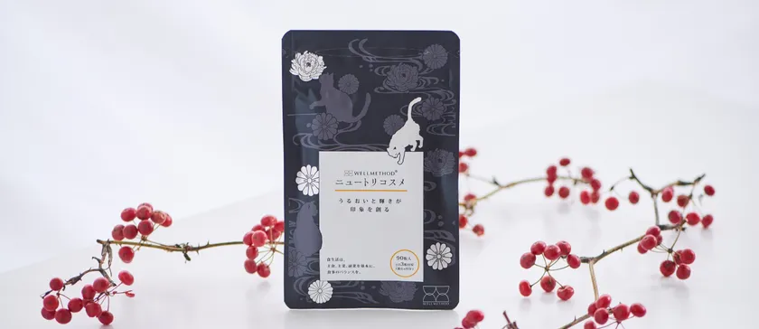 「WELLMETHOD(R) ニュートリコスメ」は、こんにゃく由来グルコシルセラミド、β-クリプトキサンチンをはじめ、ビタミン類、コエンザイムQ10、ショウガエキスを内側から補うことができる、飲む美容液発想のサプリメントです。