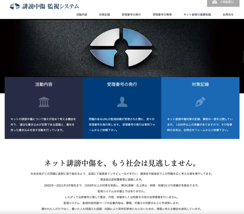 当社は、ネットの誹謗中傷で泣き寝入りせざるを得ない状況に憤りを感じ、2005年からボランティアでネットの誹謗中傷の抑止活動を行い、独自のシステムを用いて、これまでに1,500件を超える実績を重ねてきました。