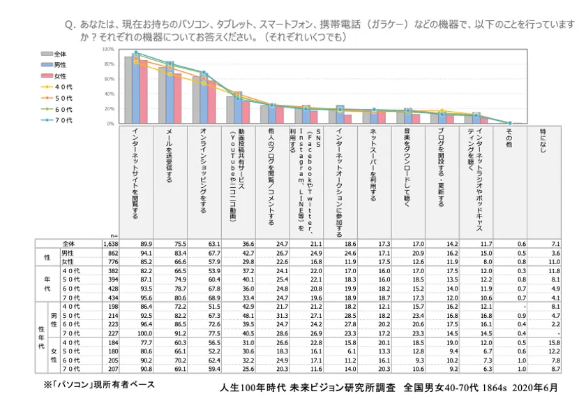 「サイト閲覧」「メール送受信」と「動画」「SNS」で使い分けています。「ネットショッピング」はパソコンが最多ですが、タブレットもスマホも続けて利用というところです。