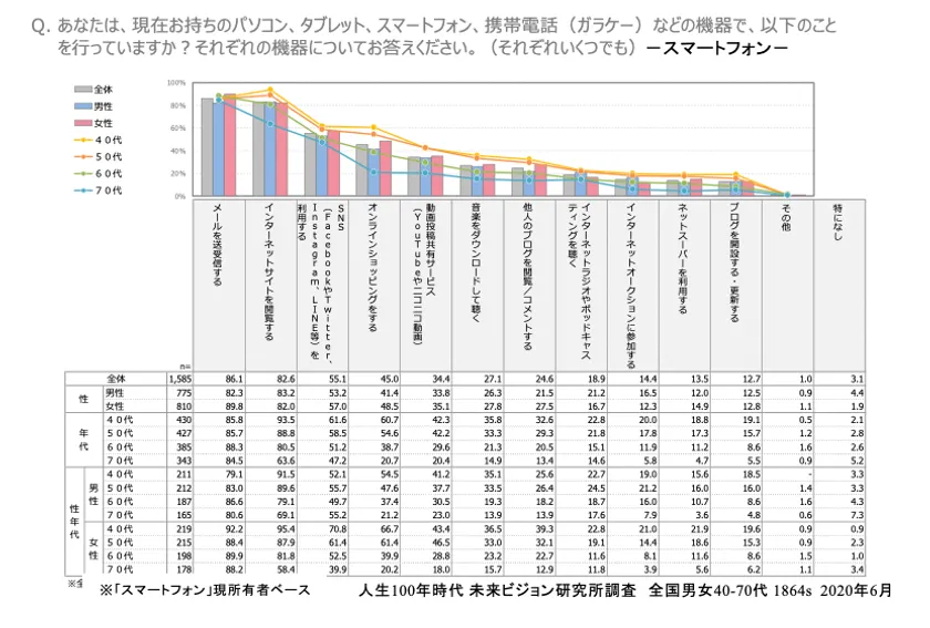 (10)スマホはやはり、「メール」およびFacebook・ツイッター・LINE・インスタなど「SNS」、に加え「オンラインショッピング」。