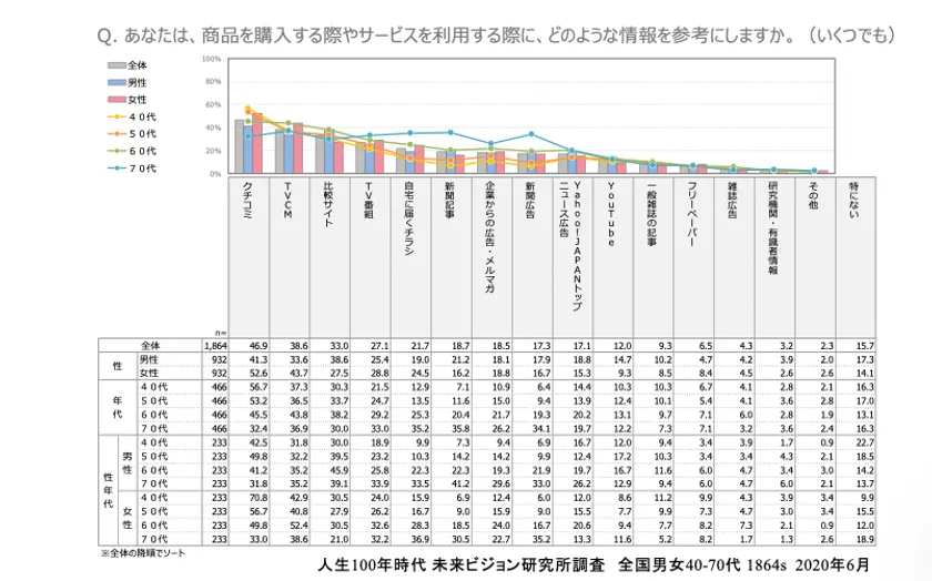■商品購入の情報源は1位「クチコミ」、2位「TVCM」、3位「比較サイト」、クチコミは40・50代女性がとくに高い。