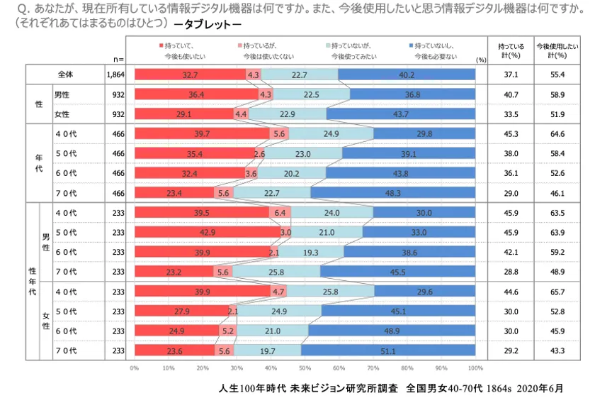■タブレットは現在所有37.%とパソコンに比べ低いが、今後の使用意向は55.4%と現所有に比べた意向は高い。