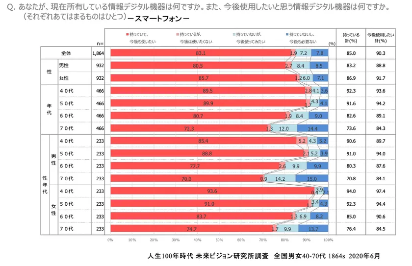 男女別ではパソコンとは逆に女性が高めで、男性の現在所有83.2%、今後の使用意向88.8%に対し、女性は現在所有86.9%、今後の使用意向91.7%となっています。
