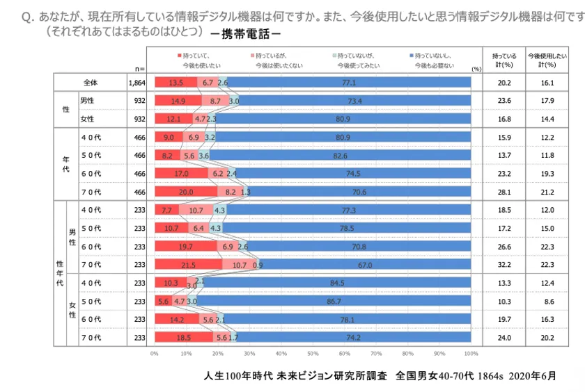 年代別には、圧倒的に40・50代が高いといえますが、70代でも現所有73.6%で今後の意向84.3%と、ガラケーからの移行は確実にすすんでいるといえます。