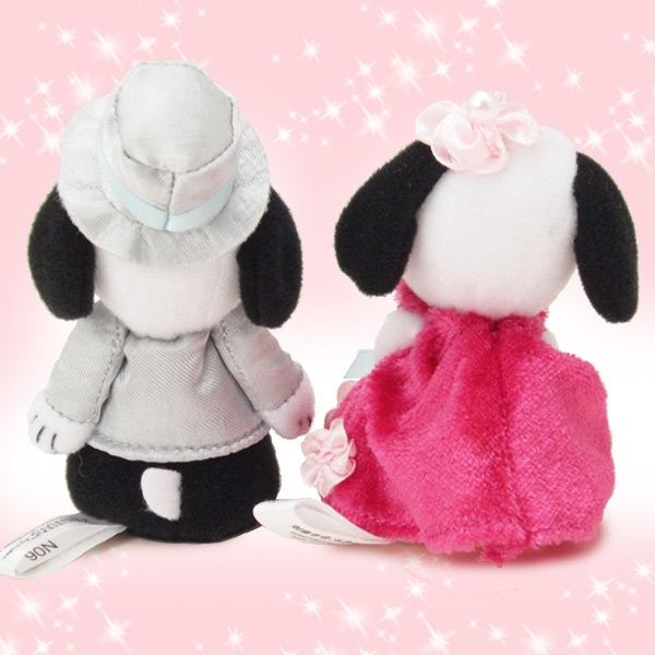 こちらは、ベルのピンクのドレスが印象的です。素材も少しふんわりした手触りで、サイズはスヌーピー:9.5cm ベル:8cm。それぞれに、サムシングブルーのリボンをつけているのもポイントです♪