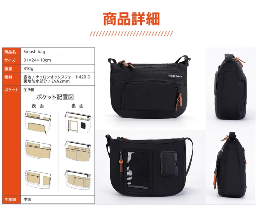 そんな要望に応える、軽快さとカッコよさはそのままに、収納力とユーザーの使い勝手の良さを徹底的に追求したSmash bag(スマッシュバッグ)。多彩なポケットで荷物の整理整頓もバッチリ、行動派のあなたをしっかりサポートします!(意匠権出願中)