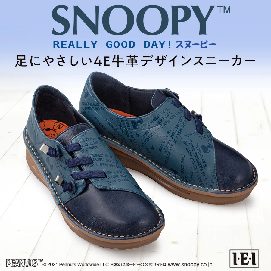 「REALLY GOOD DAY!スヌーピー 足にやさしい4E牛革デザインスニーカー」は、I・E・I オリジナルショップにて好評予約受付中です。