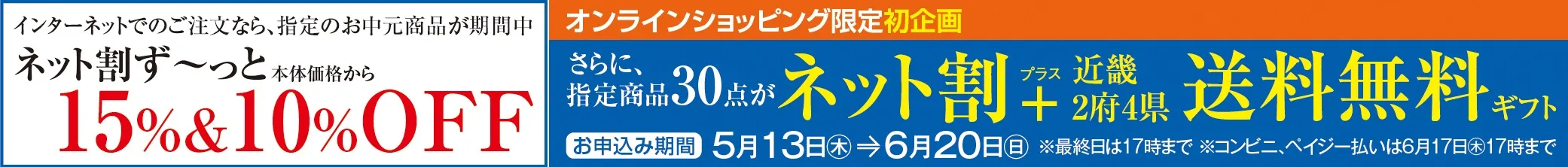 また、今回は初企画といたしまして、6月20日(日)*4までの期間に限り、指定商品30点が「ネット割」に加え、近畿2府4県送料無料でお申し込みいただけます。