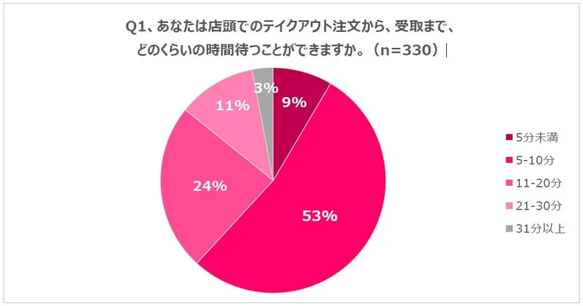 Q1、あなたは店頭でのテイクアウト注文から、受取まで、どのくらいの時間待つことができますか。