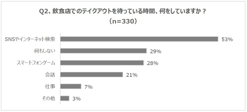 続いて、その待ち時間の過ごし方について「飲食店でのテイクアウトを待っている時間、何をしていますか?」という質問をしたところ、「SNSやインターネット検索」と回答した人が53%と最も多い結果となりました。次いで、「何もしない」が29%、「スマートフォンゲーム」が28%となりました。この結果から、テイクアウトを利用している多くの人は、その待ち時間をスマートフォンやタブレットなどを使って過ごしていることが分かりました。
