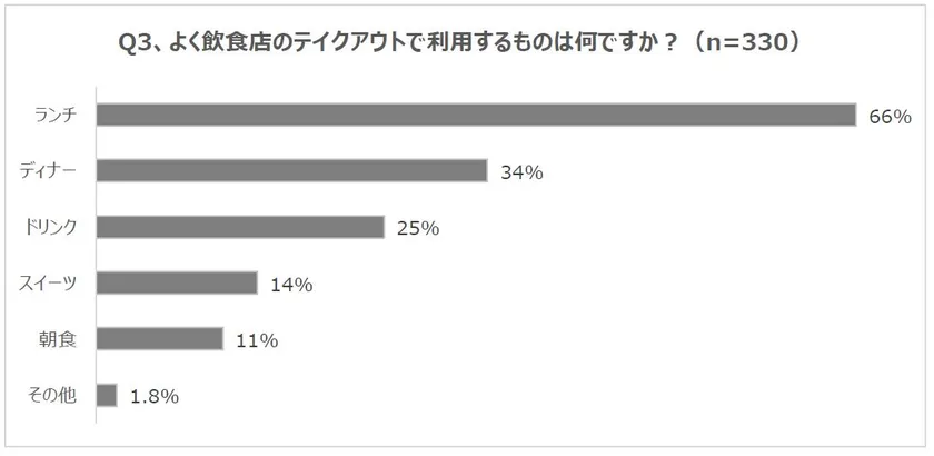 今回、「よく飲食店のテイクアウトで利用するものは何ですか?」と質問すると、1番多かった回答は「ランチ」の66%、次いで2番目に多かったのは「ディナー」の34%、3番目に多かったのが「ドリンク」25%という結果になりました。