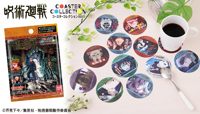 TVアニメ「呪術廻戦」の場面写を収録した、『コースターコレクション 呪術廻戦 Vol.1』が登場!コースターは、直径約75mm、厚さ約1mmで、表面フルカラー印刷、裏面モノクロ印刷の両面印刷仕様。コースター全面にはマットPPコートがかかり、美麗な場面写カットをマットな質感で再現します。全国のセリア、アニメイト、JUMP SHOP他、キャラクターショップで随時販売いたします。