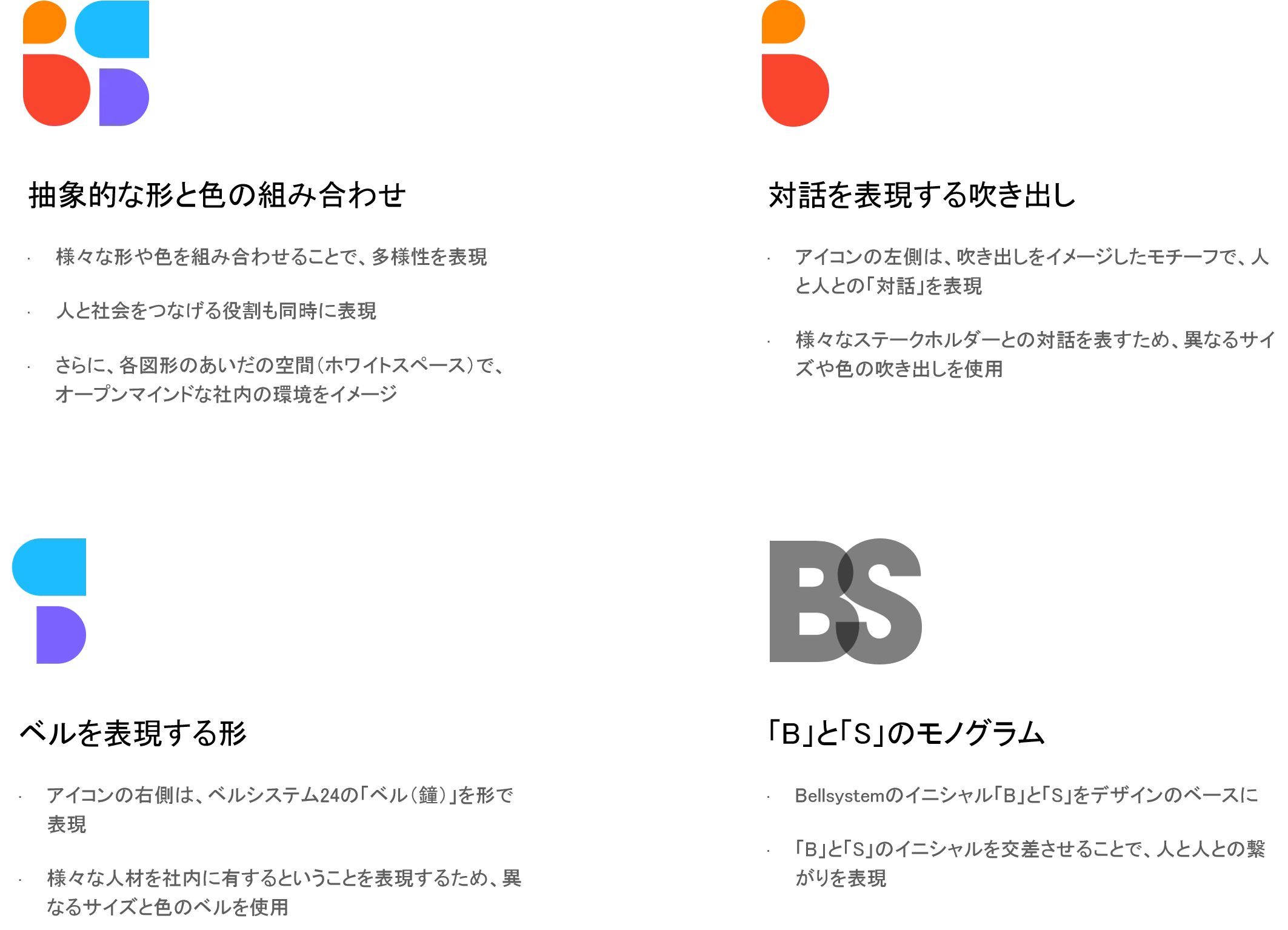 新たなロゴマークのアイコンでは、左に位置する暖色系部分でコミュニケーションを表現する「吹き出し」を、右に位置する寒色系部分では先進性とベル(鐘)を表しており、全体として頭文字の「B」と「S」を表現しています。